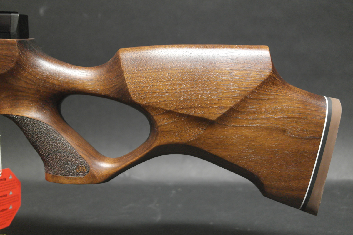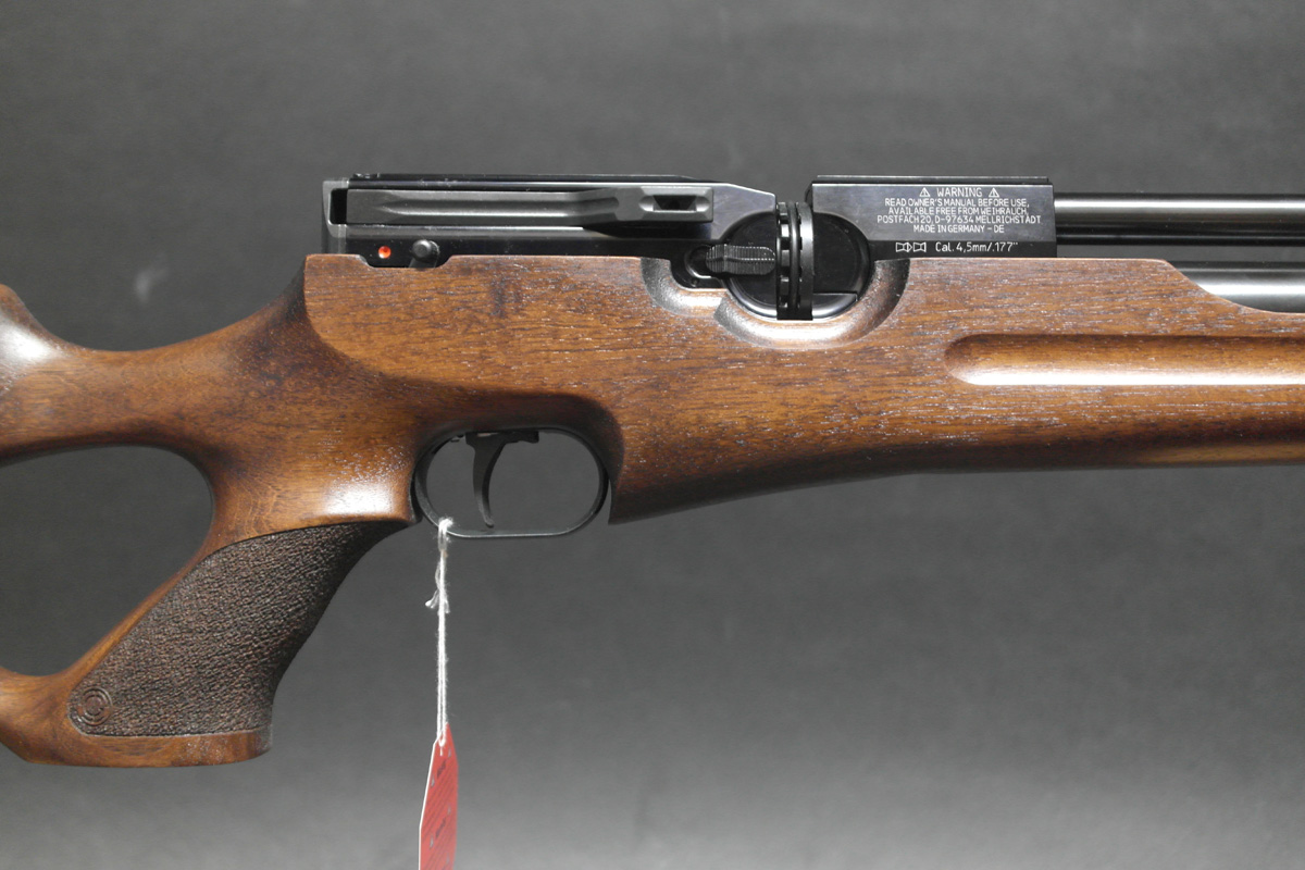 The HW100 Full Length is a full power regulated air rifle providing up to 110-140 shots per fill with anti-double load prevention system. This particular model is sitting in a nicely figured walnut thumbhole stock and includes 2x 14 shot magazines. Fully adjustable 2 stage trigger.