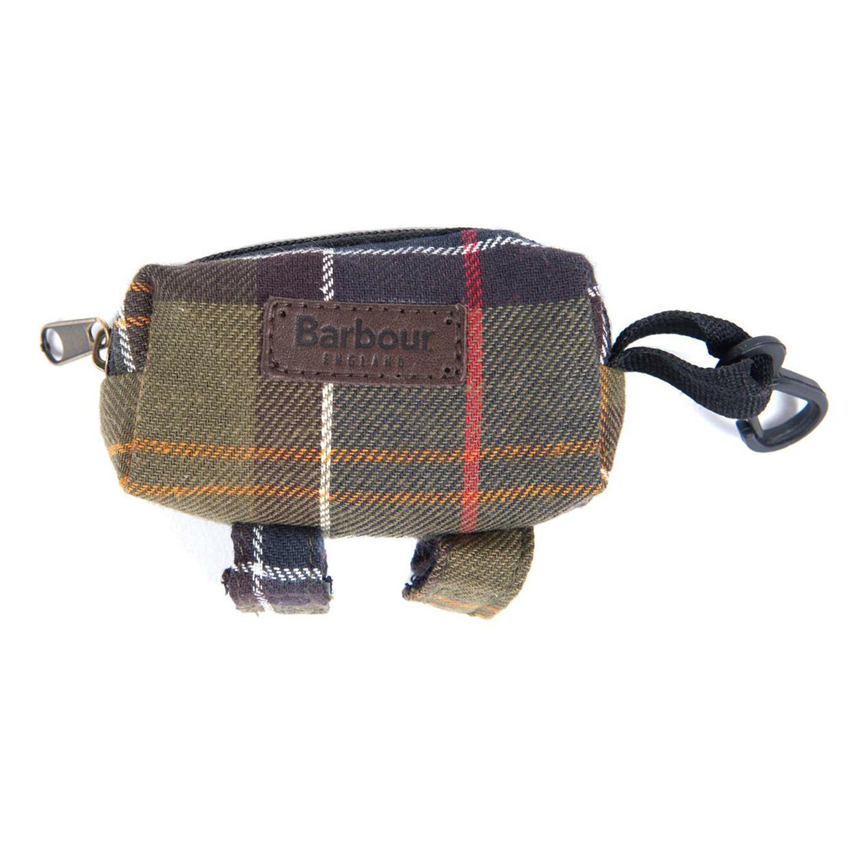 A handy Barbour classic tartan poop bag dispenser with zipped closure and embossed leather branded badge. Durable plastic dog clip attaches the dispenser to your dog lead for easy access.