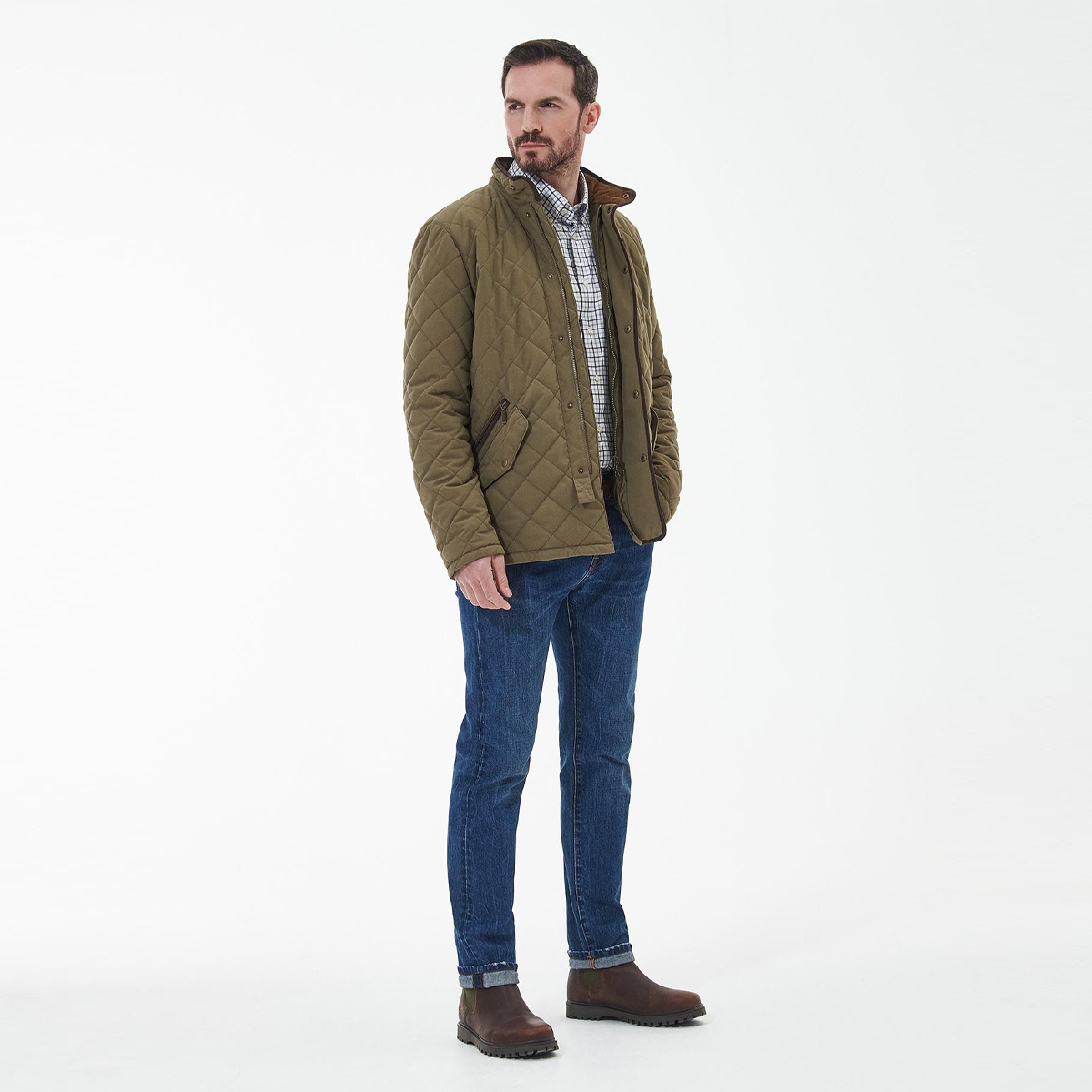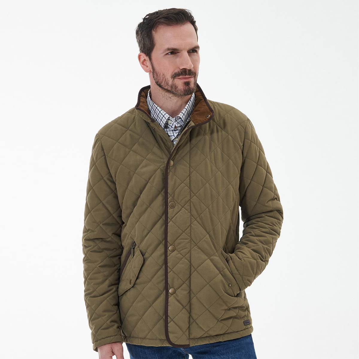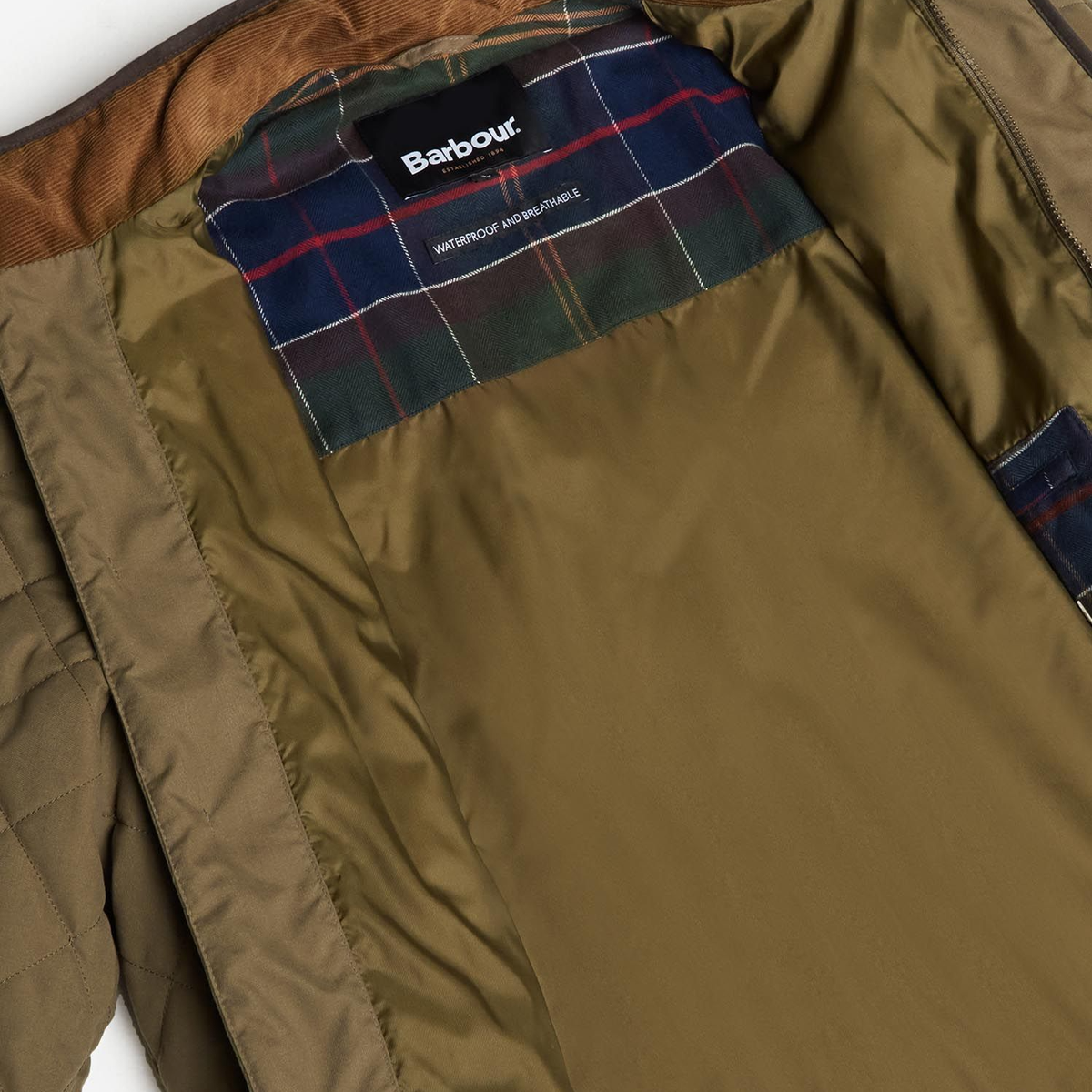 The Barbour Waterproof Shoveler Quilted Jacket boasts a stand collar and zip fastening with a stud front placket. Perfect for a warm and waterproof design, this jacket offers a tartan inner yoke and pocket and is finished with a leather badge to the bottom left of the jacket.