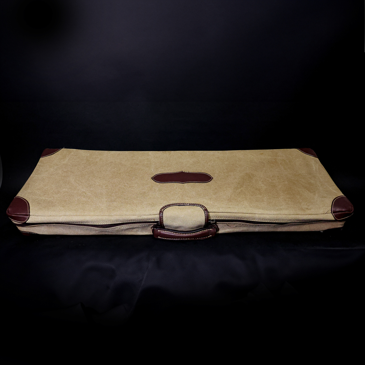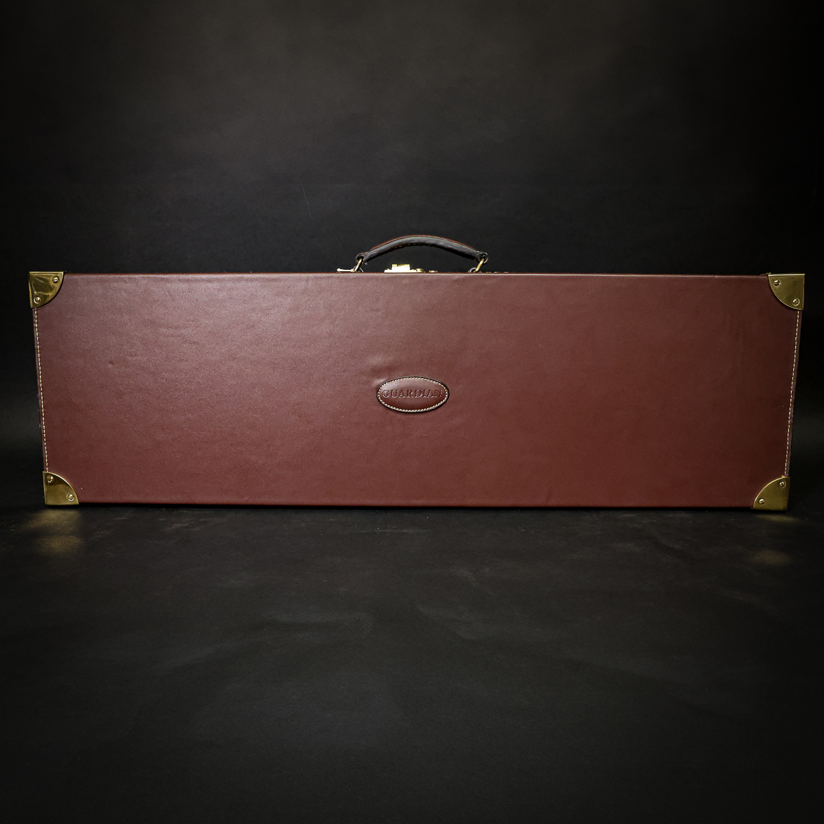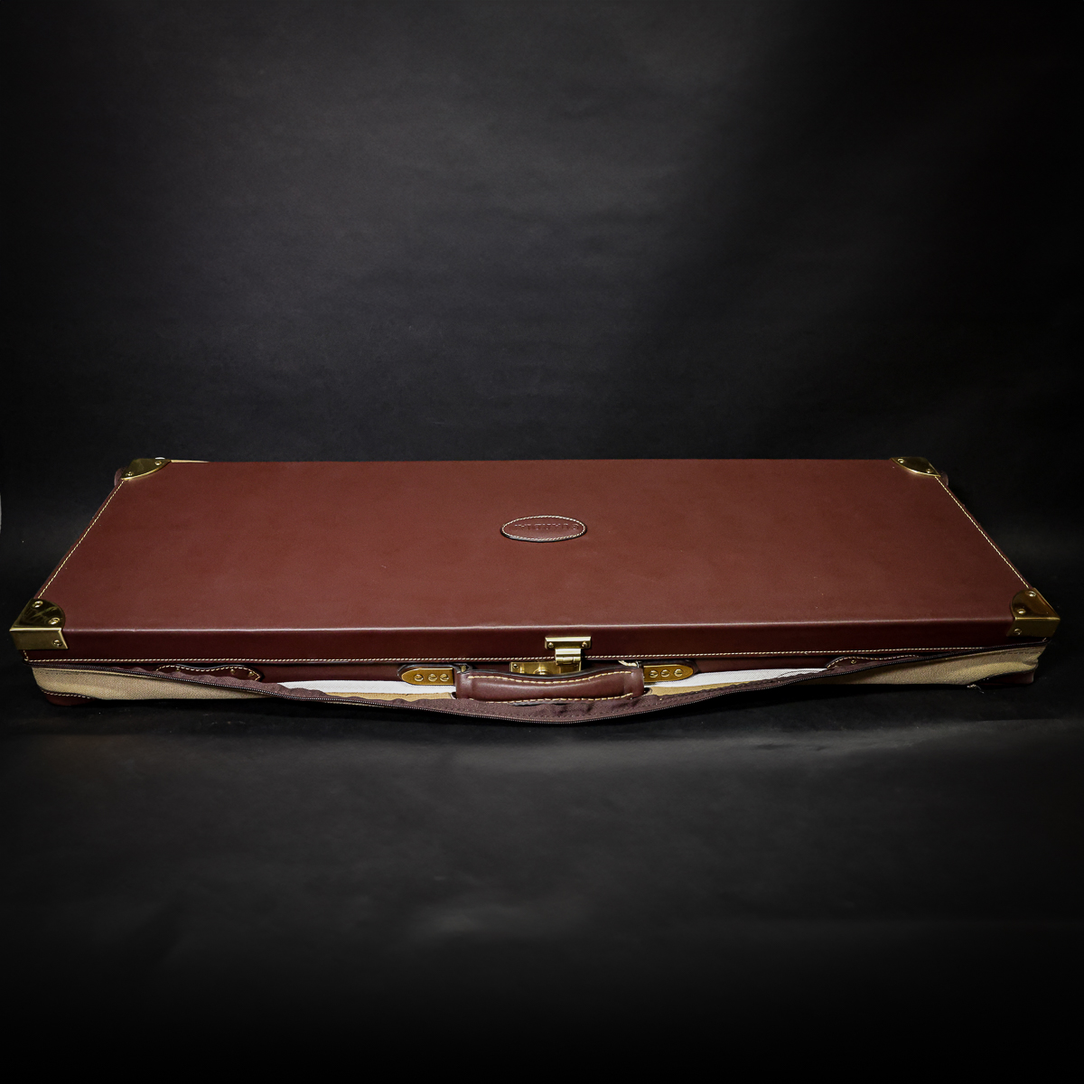 Guardian Viscount Shotgun Case with Canvas Outer Cover. Chestnut leather, exposed timber with brass corners giving a traditional look at a fraction of the cost of an English made case. The case is suitable for side by sides and over and under shotguns and will take a barrel length of up to 33″.