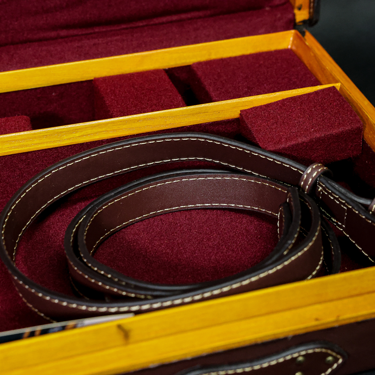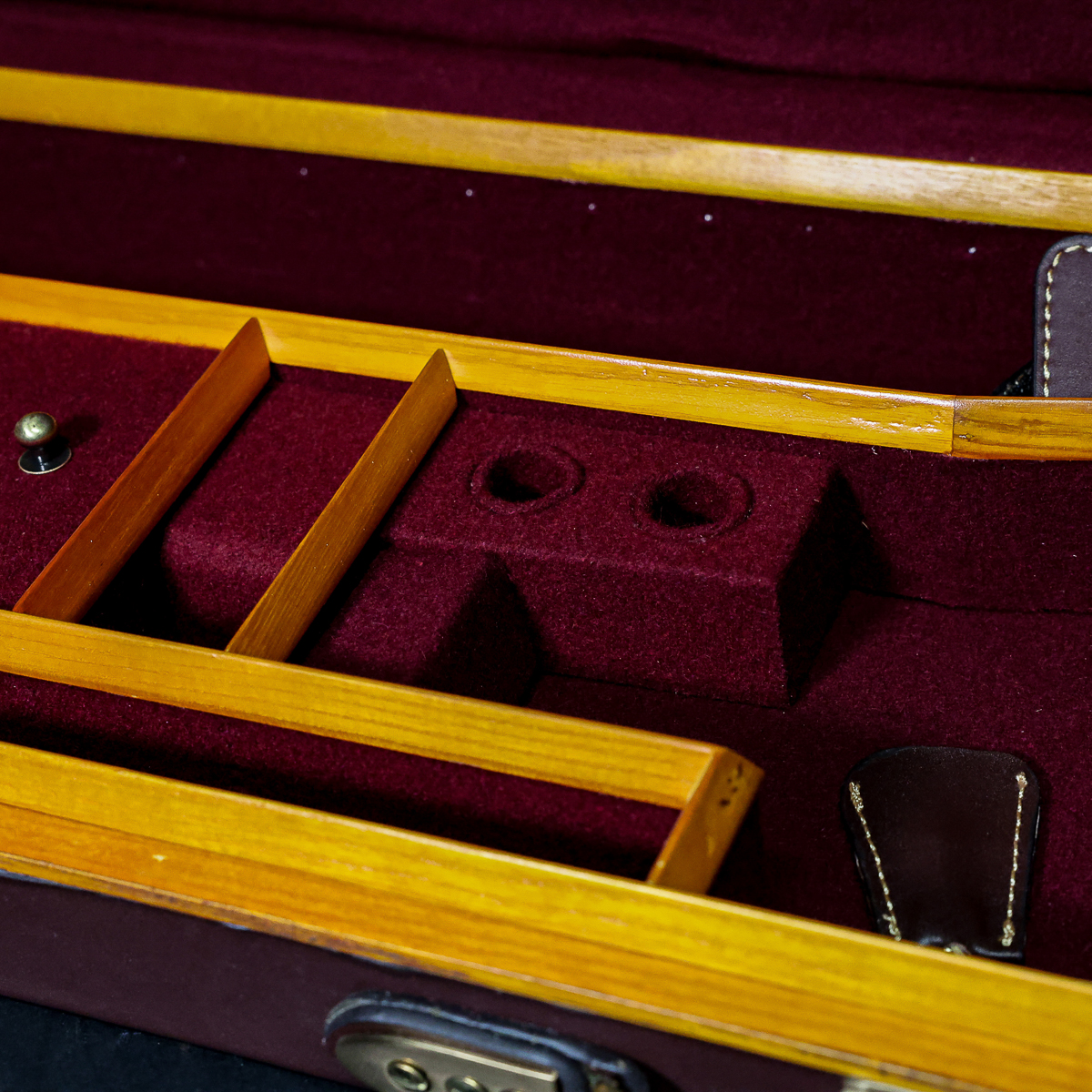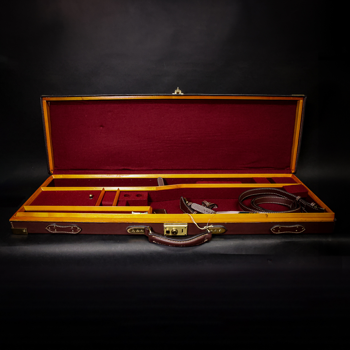 Guardian Viscount Shotgun Case with Canvas Outer Cover. Chestnut leather, exposed timber with brass corners giving a traditional look at a fraction of the cost of an English made case. The case is suitable for side by sides and over and under shotguns and will take a barrel length of up to 33″.