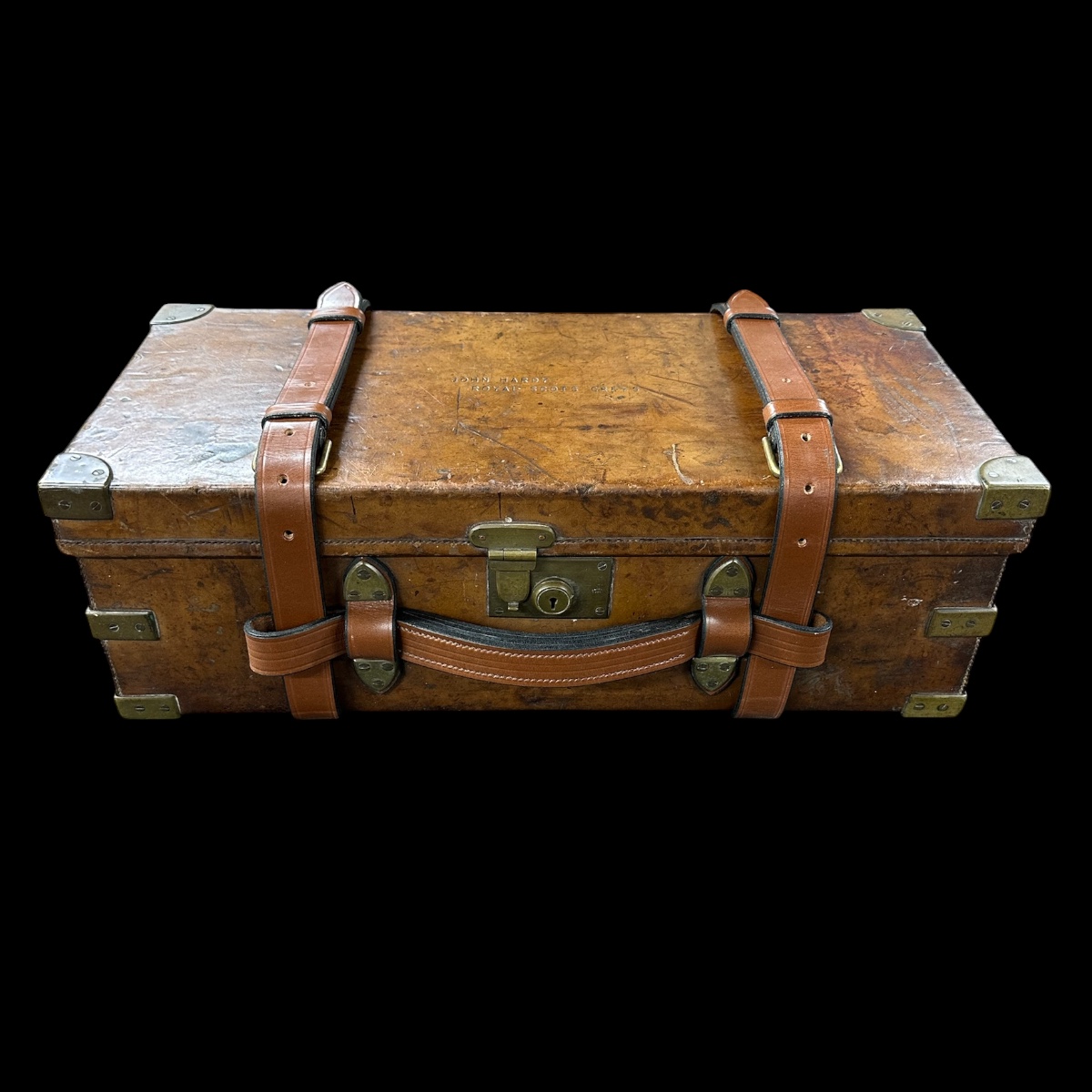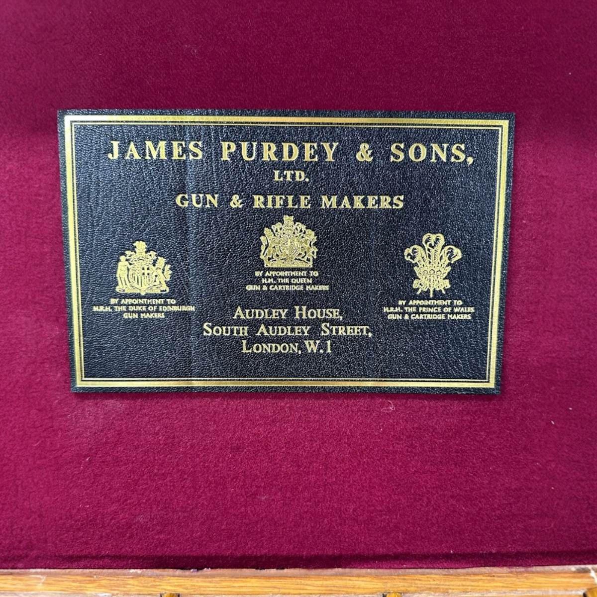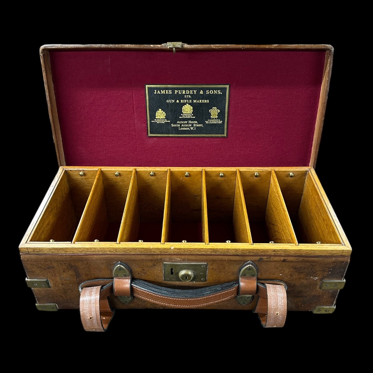 Vintage James Purdey & Sons best leather cartridge magazine made to carry up to 500 12g cartridges. Made in England using the best oak, bridle leather and brass fittings is still in very good condition. Tan coloured leather with re-inforced brass corners with seven cartridge compartments seperated by oak dividers and fitted with a James Purdey & Sons gold tooled leather label. Outside of lid stamped “John Hardy Royal Scots Greys” a must for any purdey enthusiast.