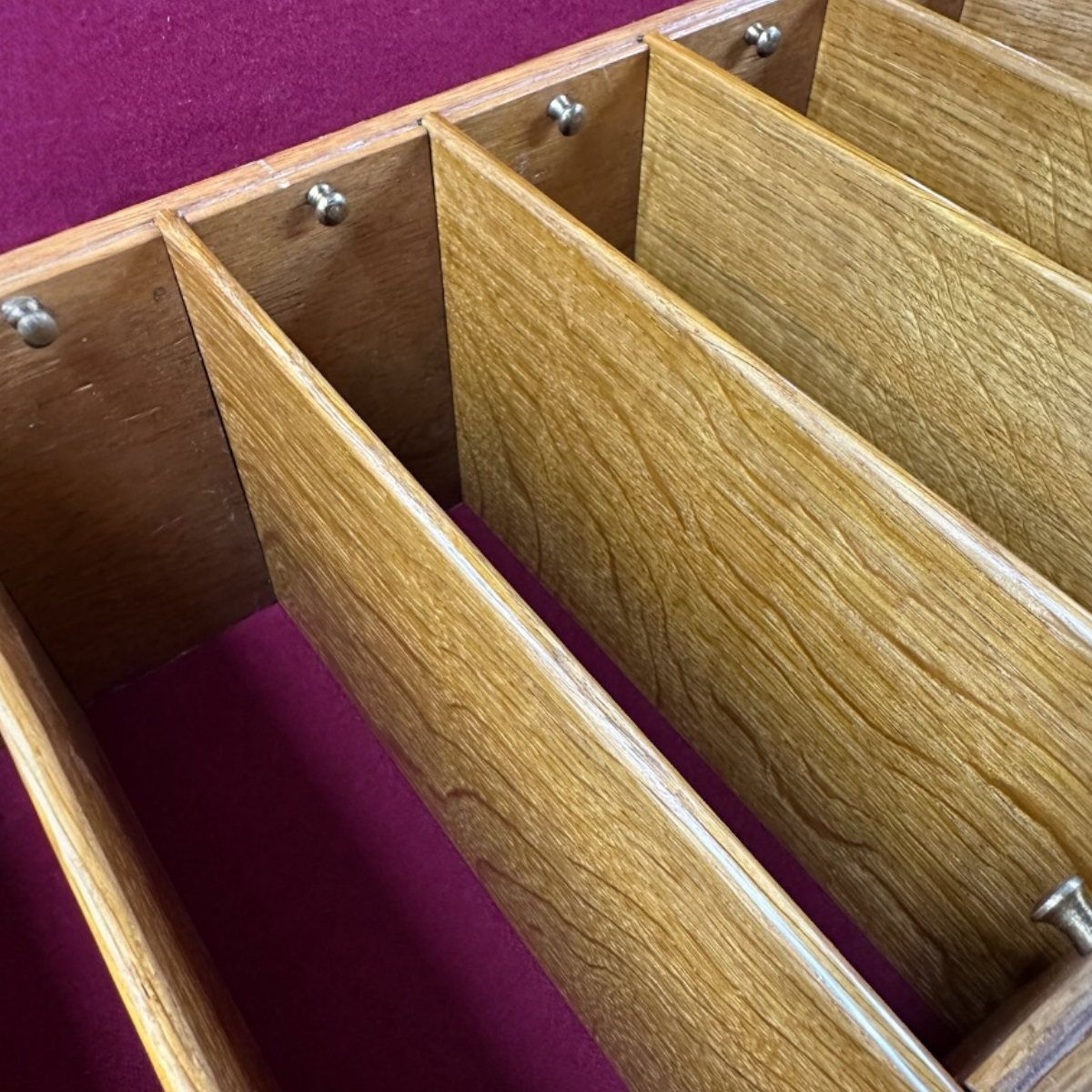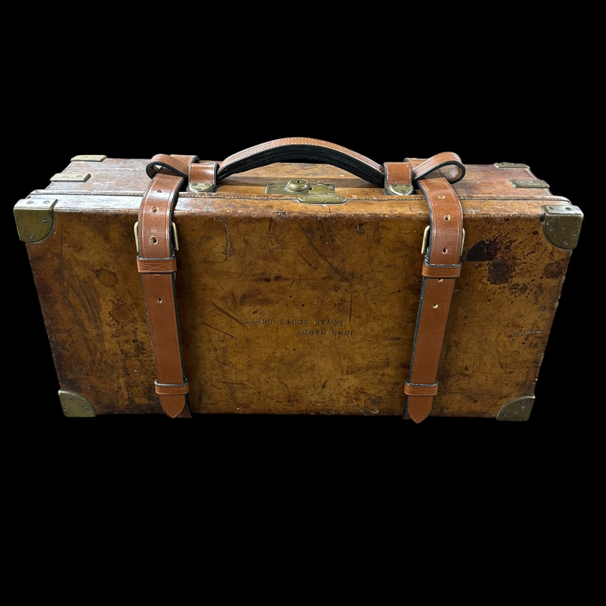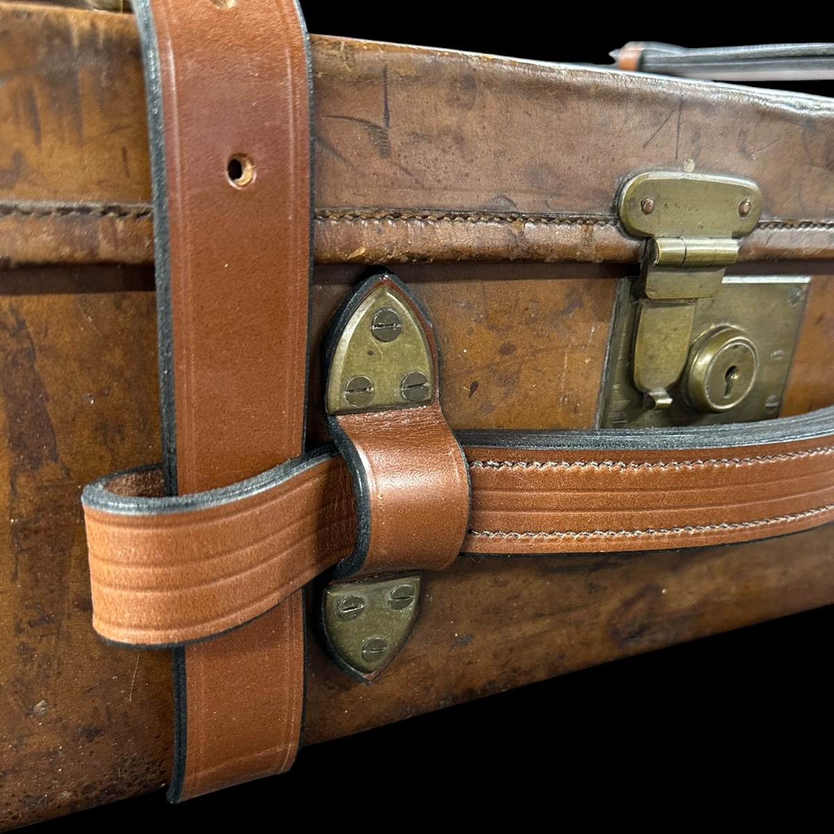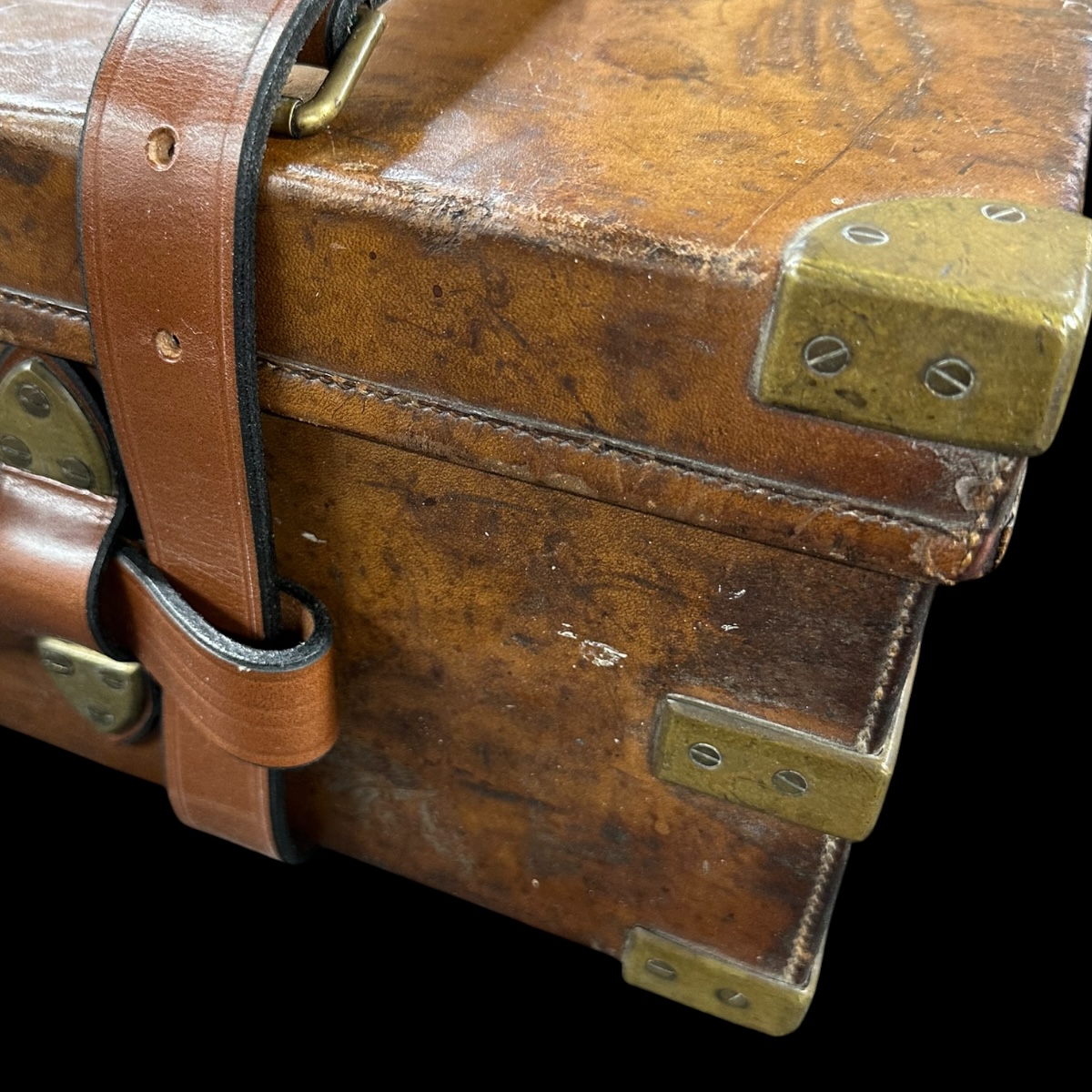 Vintage James Purdey & Sons best leather cartridge magazine made to carry up to 500 12g cartridges. Made in England using the best oak, bridle leather and brass fittings is still in very good condition. Tan coloured leather with re-inforced brass corners with seven cartridge compartments seperated by oak dividers and fitted with a James Purdey & Sons gold tooled leather label. Outside of lid stamped “John Hardy Royal Scots Greys” a must for any purdey enthusiast.